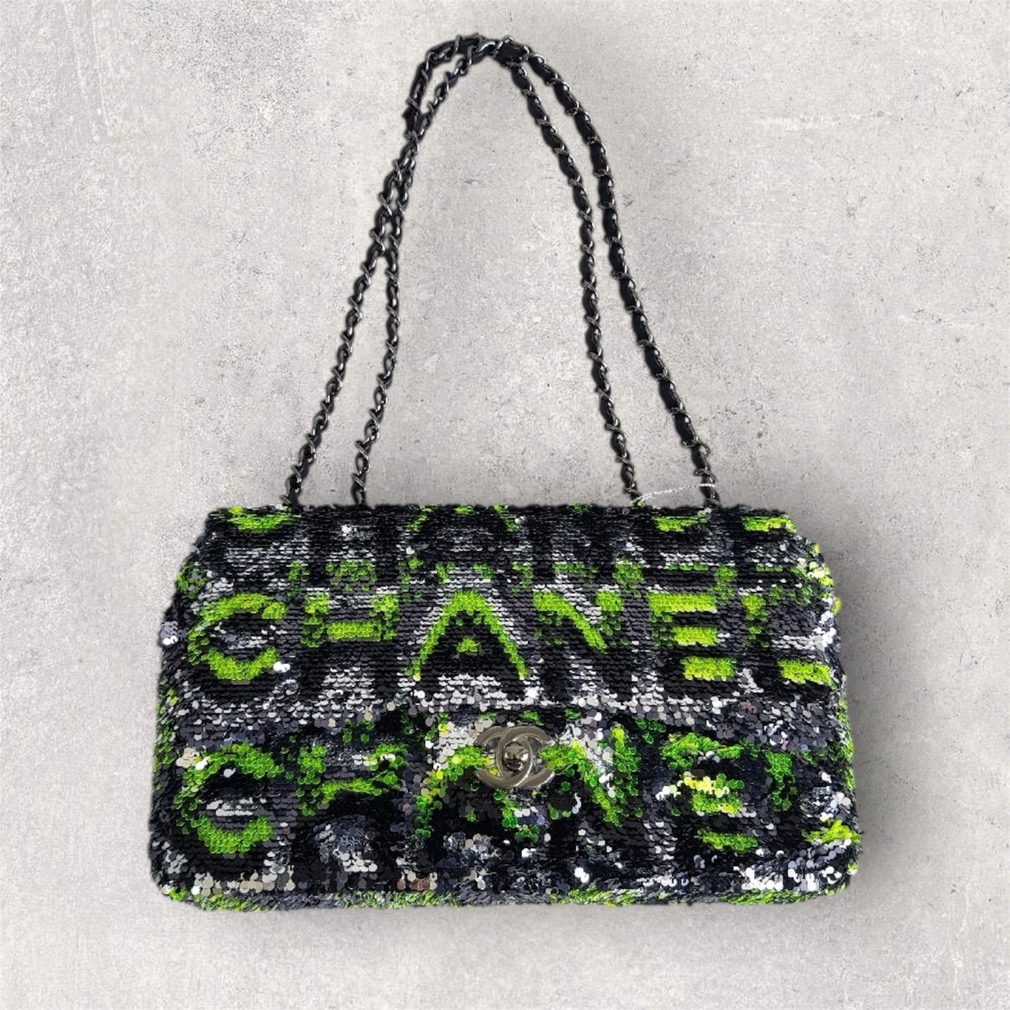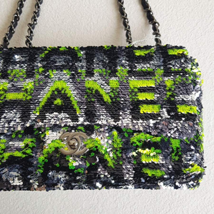 Chanel Medium Double Flap Bag Green/black/silver Sequine with Silver Hardware #RLKC-3